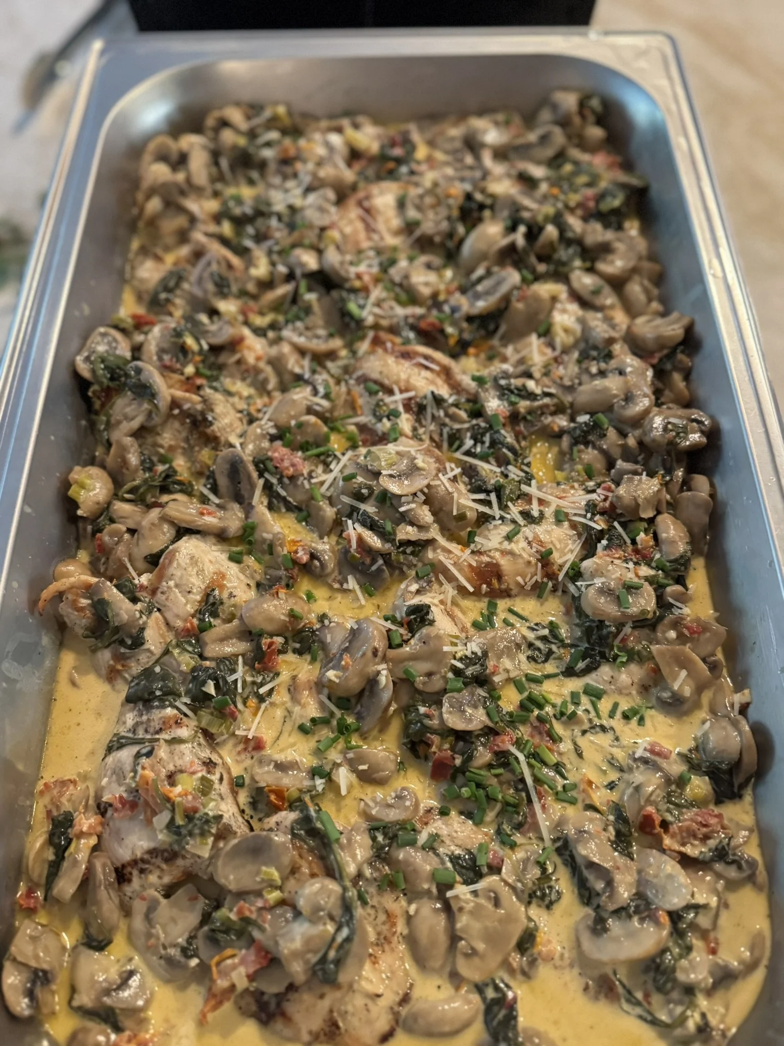 Juicy, herb-marinated chicken breast in a creamy garlic sauce with sun-dried tomatoes, spinach, mushrooms and parmesan. Bursting with Tuscan-inspired flavor